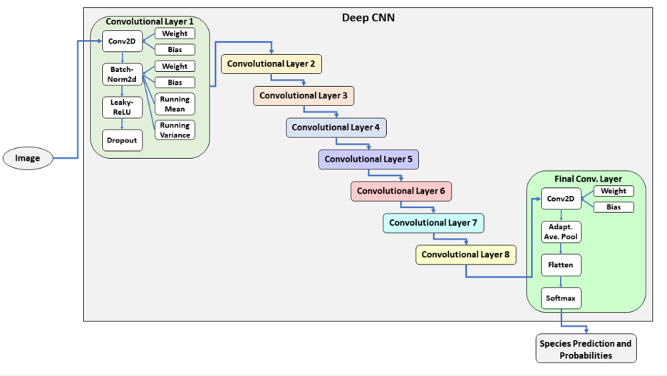 Роль DCGAN в системе заключается в увеличении ограниченного набора данных путем создания большого количества синтетических изображений для каждого вида, основанных на разделе реальных ВЭТСХ снимков. Эти синтетические данные затем использовались для обучения модели CNN, которая была проверена отдельно по отношению как к реальным, так и к синтетическим наборам данных ВЭТСХ снимков.