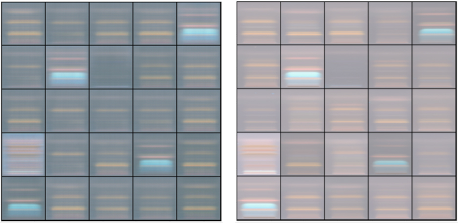 Рис. 3 Пример синтетических данных, созданных DCGAN. Левое изображение: матрица 5 × 5 25 DCGAN генерировала синтетические изображения; правое изображение: матрица 5 × 5 реальных ВЭТСХ снимков.