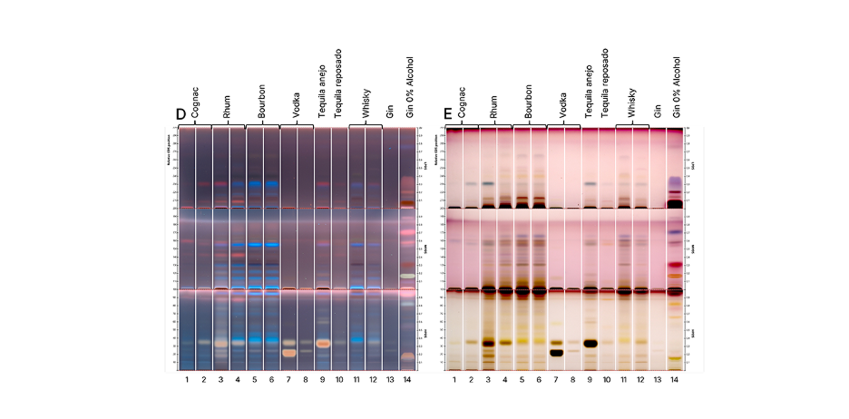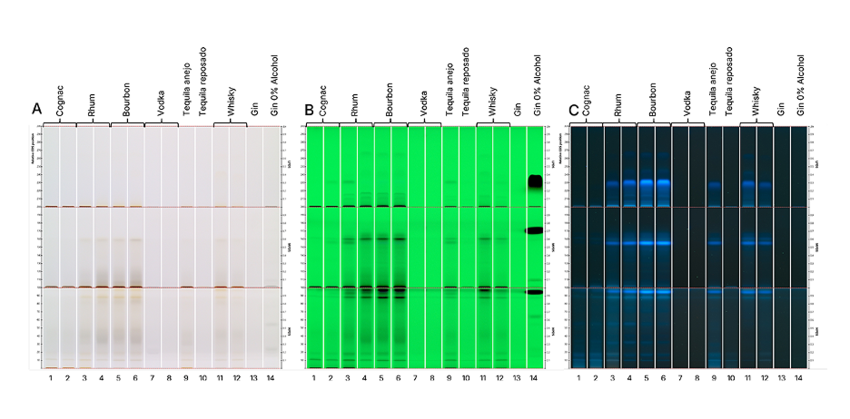 После элюирования с помощью систем CDS на треках проб было выявлено множество зон с различными классами соединений. Голубые флуоресцентные зоны, наблюдаемые при УФ 366 нм (детекция С) характерны для бочковых спиртных напитков, таких как коньяк (треки 1-2), янтарный ром (треки 3-4), бурбон (треки 5-6), выдержанная текила (треки 9-10), и виски (треки 11-12). Эти зоны отсутствовали в бесцветных напитках, таких как водка (треки 7-8) и джин (треки 13-14), что подтверждает гипотезу о том, что такая флуоресценция происходит из-за соединений продуктов, родственных лигнину и экстрагированных при хранении в бочках.