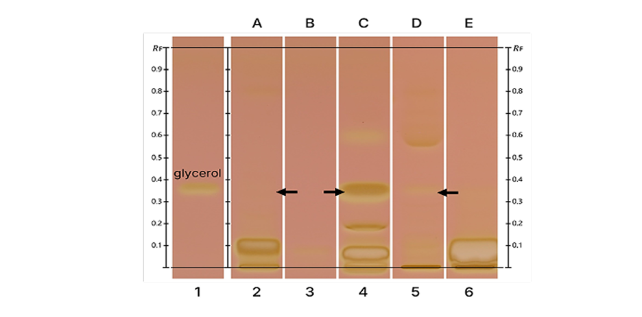 Денситометрические измерения для обнаружения глицерина проводили с использованием сканера TLC Scanner 4 в режиме флуоресценции при 520 нм (дейтериевая лампа) щель 5,0х0,2 мм и скорость сканирования 20 мм/с.