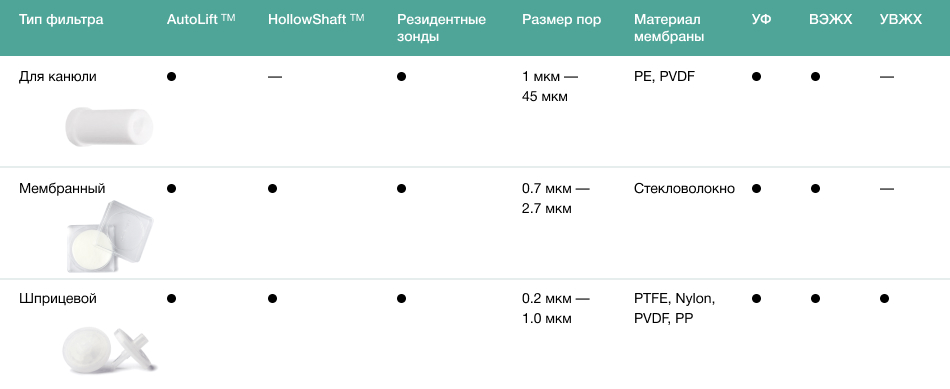 Рис.2. Совместимость фильтров для разных видов пробоотборников