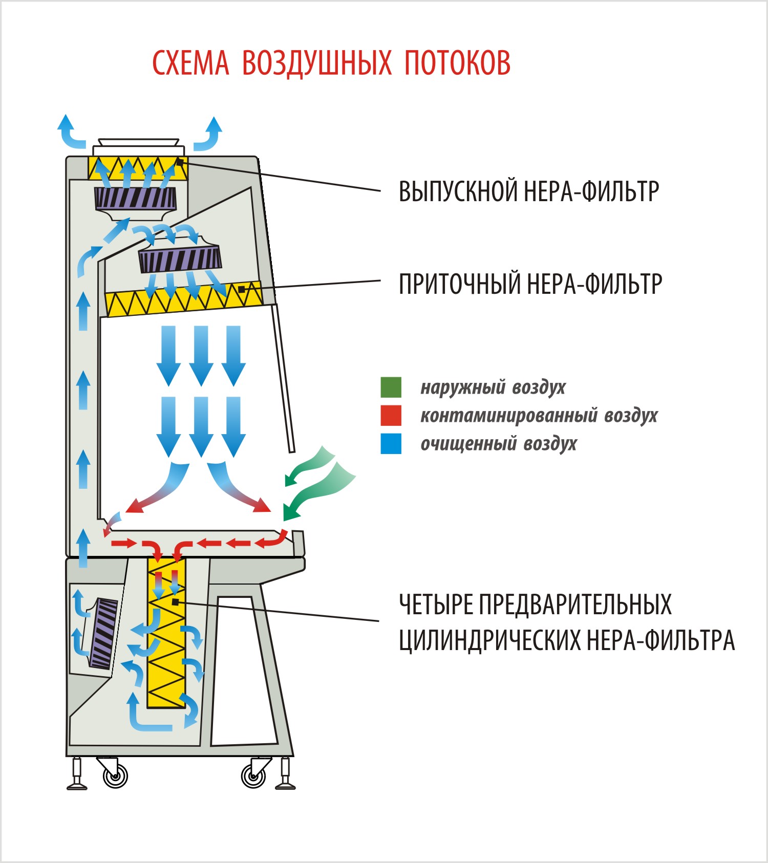 Фильтрация воздуха осуществляется с помощью впускного и выпускного НЕРА-фильтров. Также дополнительно установлены предварительные цилиндрические фильтрующие элементы. Для создания принудительного потока воздуха, бокс оснащен тремя вентиляторами.