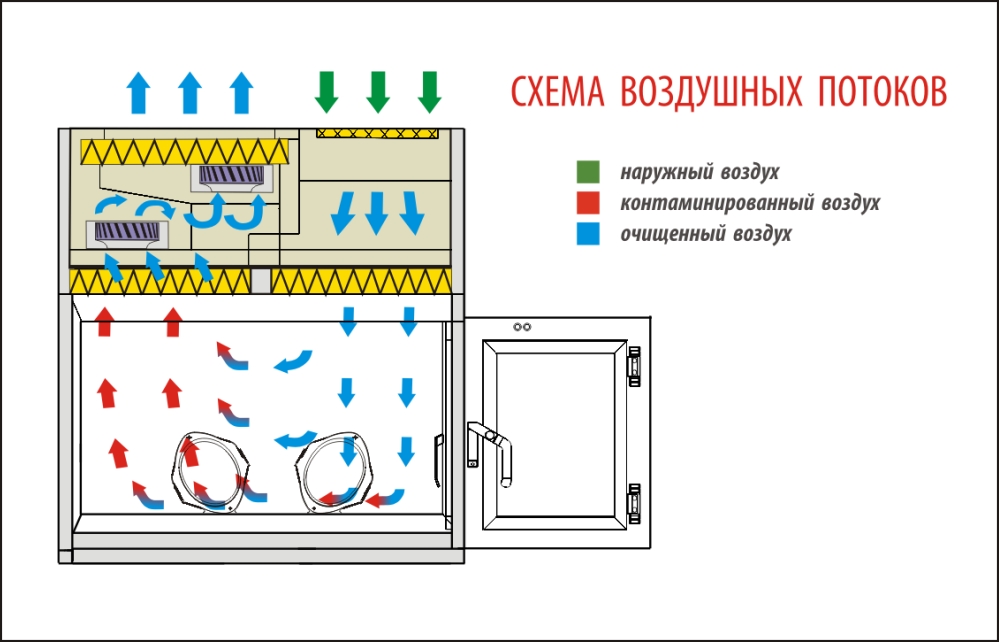 Для входящего и выходящего потока предусмотрены собственные системы фильтров. Входящий воздух проходит грубую и тонкую очистку, на выходе установлен НЕРА-фильтр. Циркуляция воздушного потока принудительная, осуществляется с помощью электровентиляторов. Всего конструкцией предусмотрено четыре вентилятора. Блок вентиляторов имеет собственные предохранители.