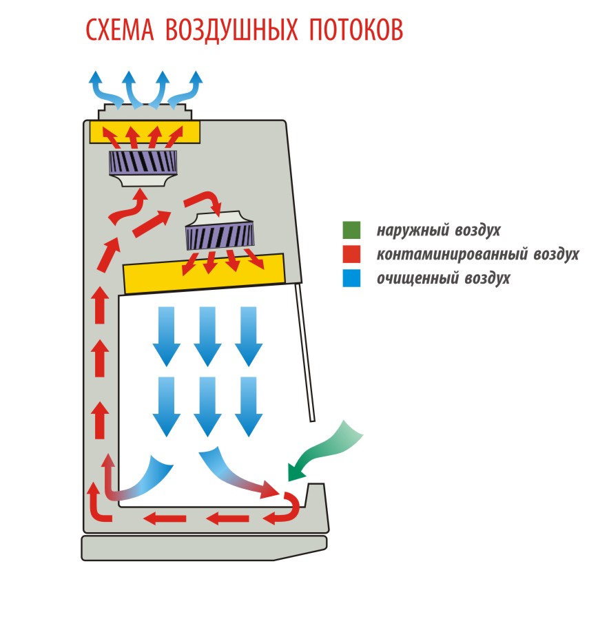 Для очистки воздуха используются НЕРА-фильтры типа Н14. Они установлены как на входе, так и на выходе воздушного потока. Такая конструкция позволяет полностью изолировать рабочую зону от окружающей среды. Воздушные потоки движутся благодаря работе вентиляторов, а скорость движения воздуха контролируется датчиками.