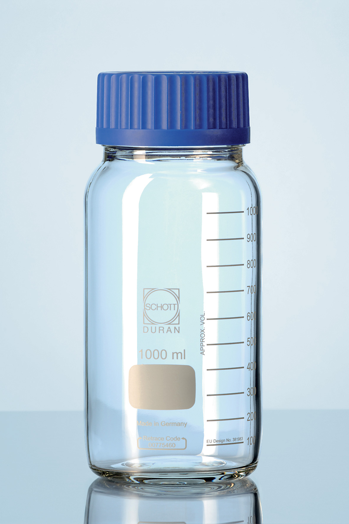 Лабораторные бутыли с широким горлом GLS80 доступны в комплекте с быстросъемной синей крышкой и сливным кольцом обеспечивающим бескапельный розлив и чистую безопасную работу.