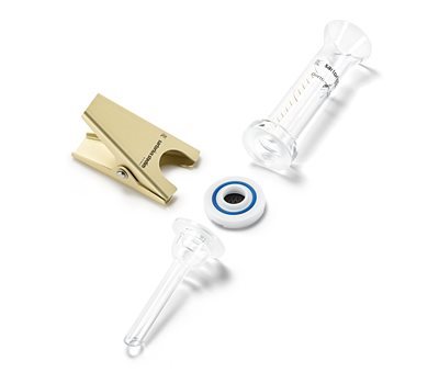 Из-за легкости очистки устройство с основанием из сетчатого фильтра, покрытого ПТФЭ предпочтительно использовать в том случае, когда требуется фильтрат или когда необходимо исследовать жидкости, которые трудно удалить со стеклянных фритт. Кольцо из ПТФЭ, удерживающее стеклянную фритту и основу сетчатого фильтра, позволяет автоклавировать устройства с установленным фильтром и защищает кромку стеклянной фритты от повреждений и потенциальных протечек. Вокруг верхнего края устройства имеется ободок, упрощающий установку мембранного фильтра, а силиконовое уплотнительное кольцо в нижней части предназначено для обеспечения герметичного уплотнения со стороны фильтрата. Верхняя часть в форме воронки упрощает заполнение при отборе проб.