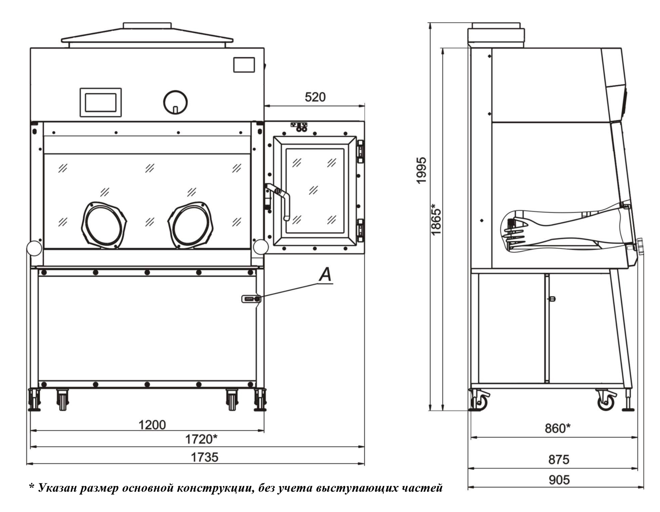Бокс представляет собой вентилируемую камеру с рабочим окном, через которое оператор может проводить манипуляции внутри бокса. Рабочая камера физически изолирована от оператора и окружающей среды (работа осуществляется через стекло, к которому жестко закреплены специальные (камерные) перчатки). Внутри рабочей камеры во время работы бокса постоянно поддерживается повышенное давление по отношению к окружающей среде в пределах ≈ 30-50 Па. Данная модель изолятора - на 2 перчаточных порта - может изготавливаться как с передаточным шлюзом, так и без него.