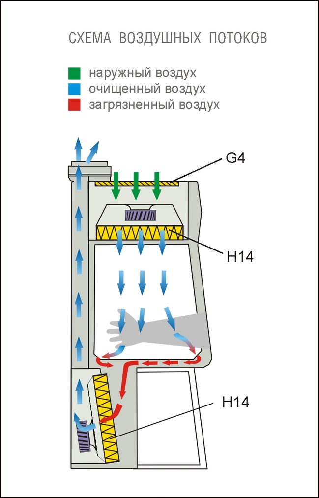 Воздух, поступающий в рабочую камеру, проходит через приточный НЕРА-фильтр, затем нисходящим однонаправленным потоком с однородной скоростью проходит через неё, захватывает возникающие в процессе работы загрязнения и вытягивается из рабочей камеры через воздухозаборные отверстия в передней и задней части основания. Далее удаляемый воздух через выпускной НЕРА-фильтр выбрасывается в окружающую среду. Избыточное давление и физический барьер (стекло, перчатки) препятствуют проникновению наружных загрязнений внутрь рабочей камеры. Таким образом, при работе бокса внутри рабочей камеры создается и поддерживается высокая чистота воздушной среды, которая обеспечивает защиту продукта (в т.ч. от перекрестной контаминации). Фильтрация воздуха, удаляемого из рабочей камеры, обеспечивает защиту оператора и окружающей среды от вытесняемых из рабочей камеры загрязнений.