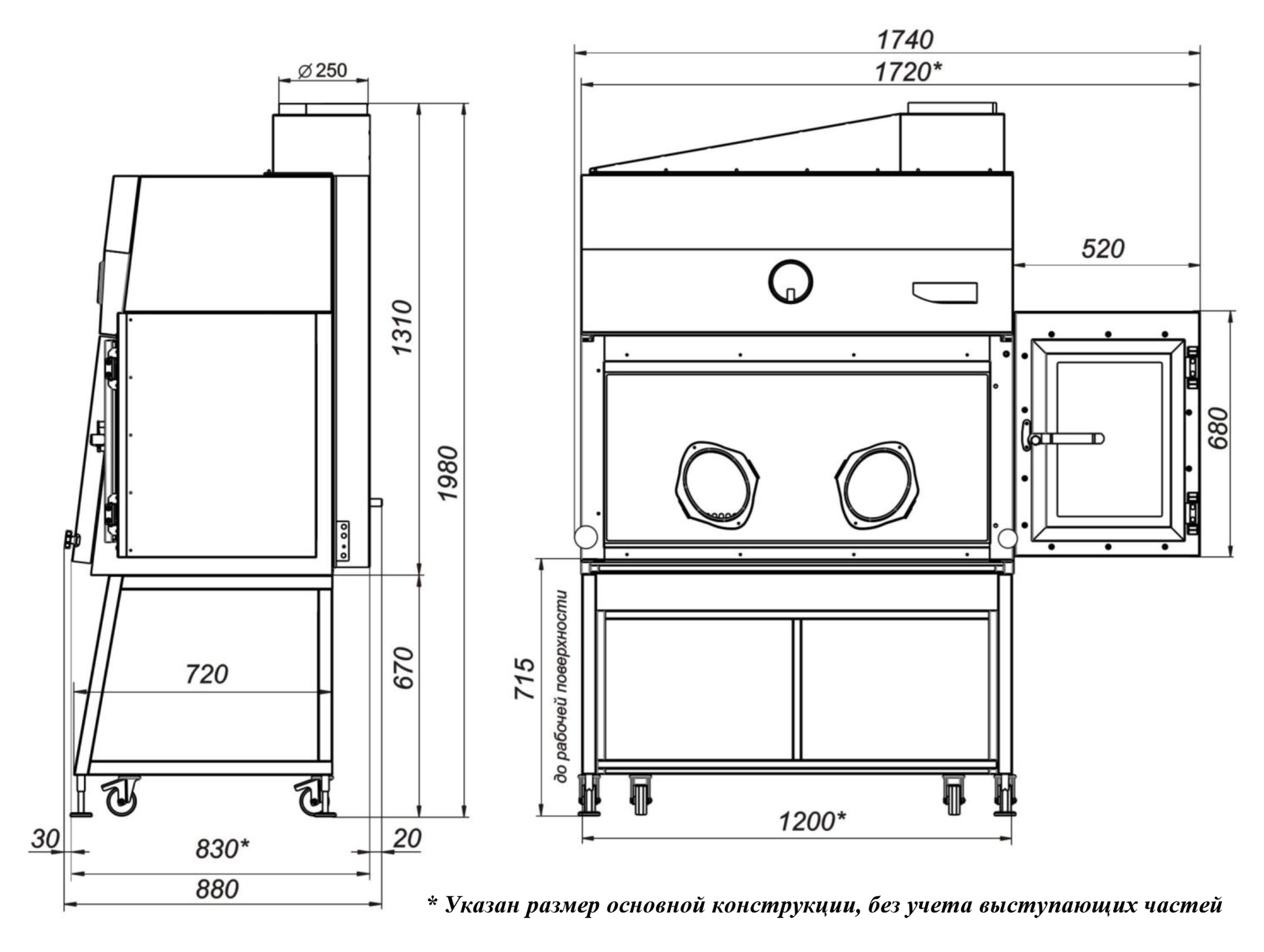 Фронтальная часть выполнена из триплекса, поднимается на газовых амортизаторах. В передней части оборудовано два порта с бутиловыми перчатками. Этот материал непроницаем для агрессивных веществ, устойчив к перепадам температур. Оператор может безопасно работать с разными веществами.