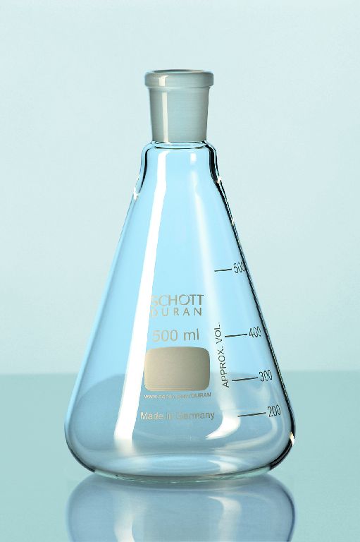 Колба Эрленмейера DURAN со стандартным шлифом с легко читаемой шкалой и большим полем для маркировки.