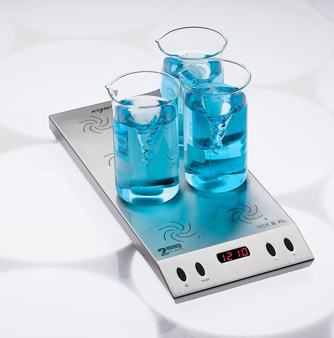 Полностью необслуживаемая концепция индукционного магнитного привода 2mag для быстрого перемешивания растворов. Ступенчатая регулировка мощности: более высокая мощности для перемешивания больших объемов или вязких растворов или сниженная мощность для длительной работы без нагрева.