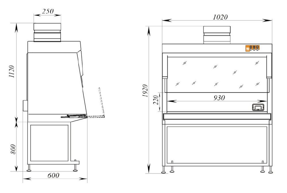 Оборудование представляет собой бокс, установленный на металлическую рамочную подставку, оборудованную полкой для ног и винтовыми опорами для фиксации. Передняя стенка сконструирована в виде откидной дверцы на газовых амортизаторах, сделана из триплекса, устойчивого к воздействию химических соединений и перепадов температур.