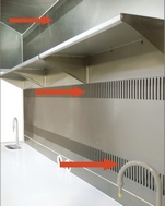 Вытяжной шкаф подключается к наружной вытяжке с помощью гофрированной трубы. На выходе установлен обратный клапан, воздушный поток направляется вентилятором. Забор воздуха из внутренней камеры осуществляется с трех уровней, поэтому все токсические вещества быстро удаляются из шкафа.
