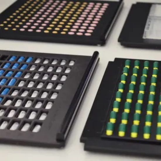 Стандартные лотки для спектрометра TRS100 могут вмещать до 100-200 таблеток, в том числе покрытые оболочками или цельных капсул; несколько десятков стеклянных флаконов или образцов порошка. Кроме того, имеется возможность изготовления нестандартных лотков в зависимости от требований заказчика.